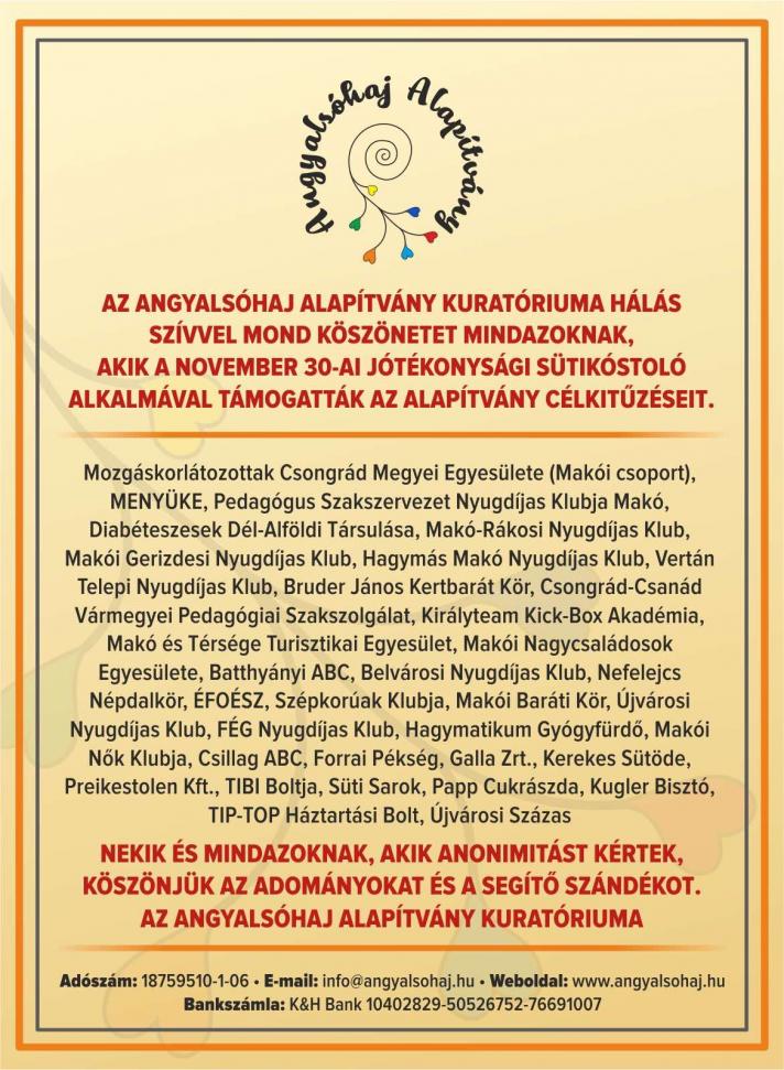 » Az Angyalsóhaj Alapítvány kuratóriumának köszönetnyílvánítása