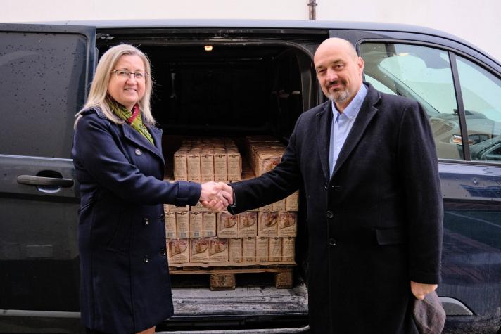Az adományt Farkas Éva Erzsébet polgármester asszony, alapítványunk fővédnöke vette át és hamarosan azokba a csomagokba kerül, amelyeket nagy szeretettel adunk át a rászorulóknak.