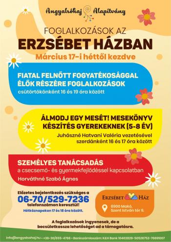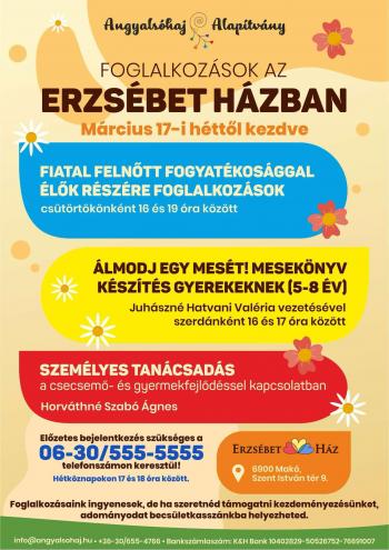 Március közepétől már elérhetők Horváthné Szabó Ágnes gyógypedagógus közreműködésével az új, fejlesztő foglalkozások a makói Erzsébet házban. A szakember több korosztály számára tervez olyan rendszeres, délutáni programokat, amelyek segítséget tudnak adni a nem megfelelő ütemű fejlődés gyanúja vagy a már diagnosztizált fogyatékosság esetén.
